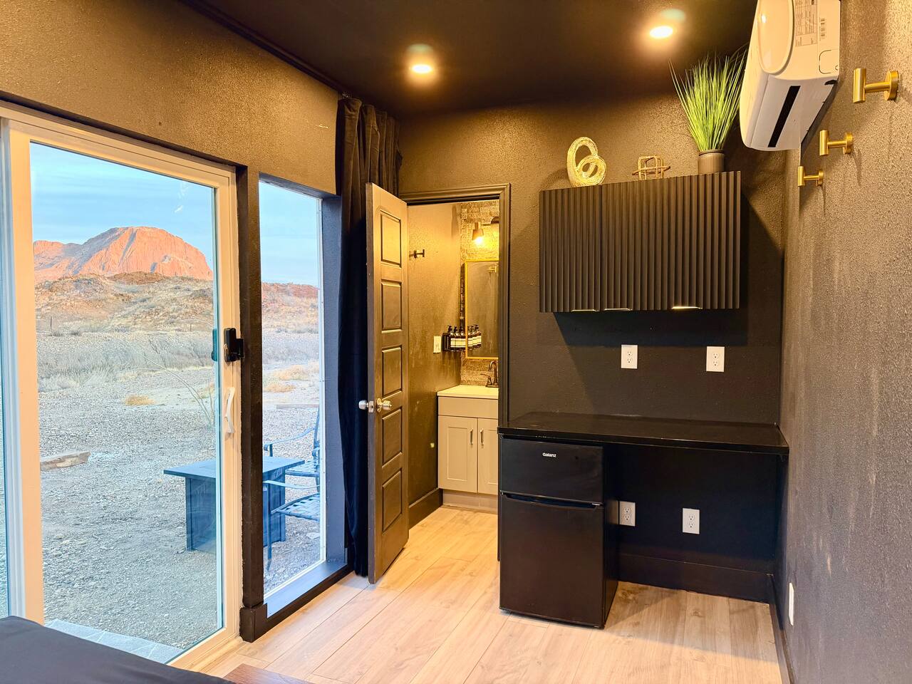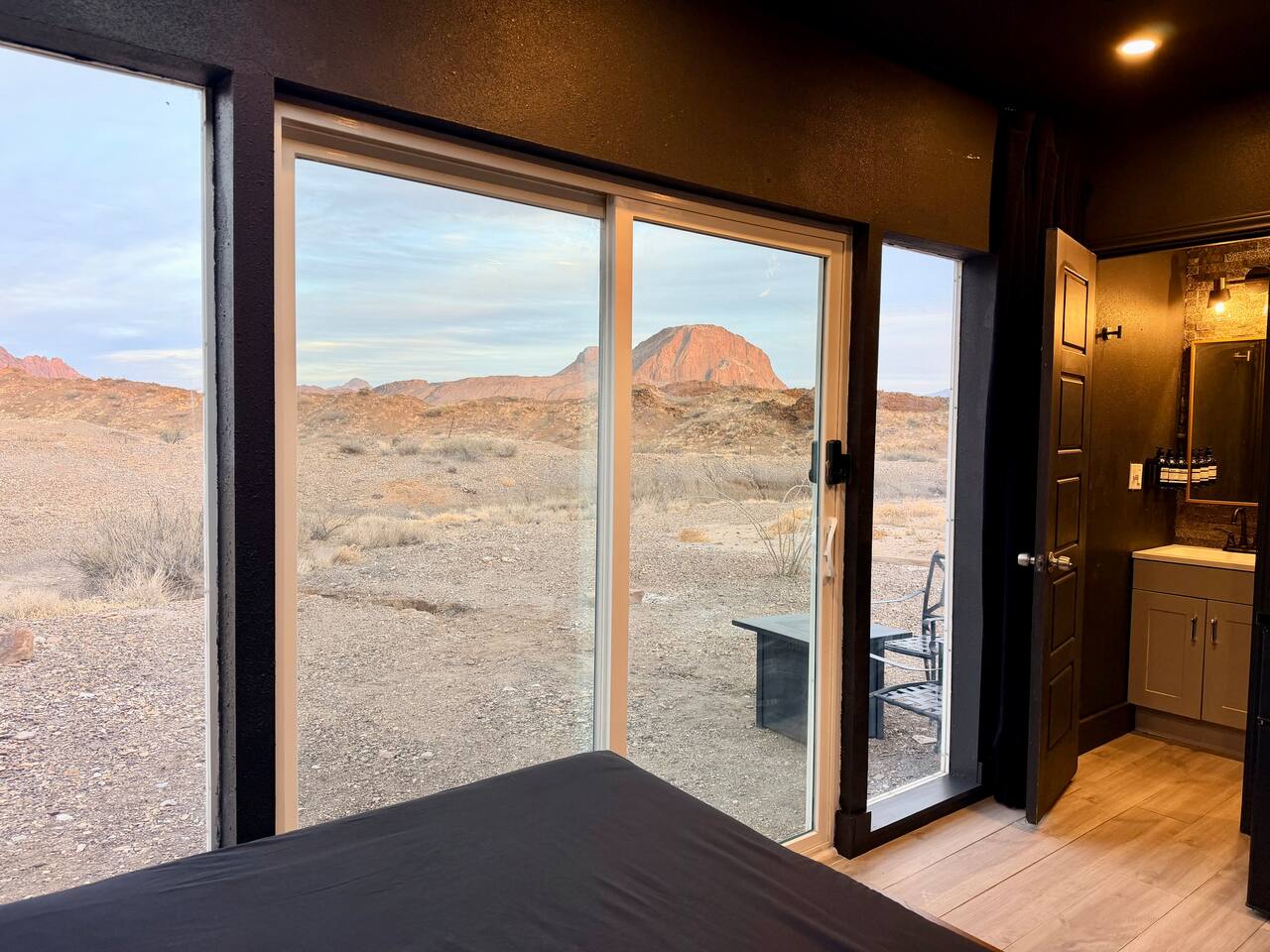 Each unit is thoughtfully designed with a convenient kitchenette space featuring a mini fridge, ideal for preparing light meals and snacks. After a day of adventure, guests can refresh in their full bathroom before unwinding in their private sitting area, complete with a cozy propane fire pit. Moreover, our hotel-quality queen beds provide an unmatched opportunity to marvel at the stars all night through giant windows and a skylight, offering a truly magical experience. Although our off-grid nature escape offers a peaceful retreat from the digital world, we also provide Wi-Fi throughout the property for your convenience should you choose to stay connected. We are less than 20 minutes to both Big Bend National Park and Terlingua Ghost Town, but tucked away from heavily traveled roads and highways. Our property offers the perfect blend of proximity to local attractions without the disruption of noise or traffic. Embrace the off-grid charm alongside modern amenities, making it an ideal destination for those seeking a serene retreat in the heart of nature. Like most properties on dirt roads in the area, heavy rains can make the roads difficult for travel/impassable for hours to days. There are a few dry creek crossings that can occasionally flash flood, but they usually clear within a few hours after the rain. Although rain in the desert is rare, if there is moderate rain, we simply ask that guests wait until it has passed and roads are clear before traveling. If we anticipate severe rain during your stay, we will contact you to discuss options. We also have other nearby accomodations that are shown in the photos and available to rent. Please let us know if you would like to book more than one unit for additional discounts.