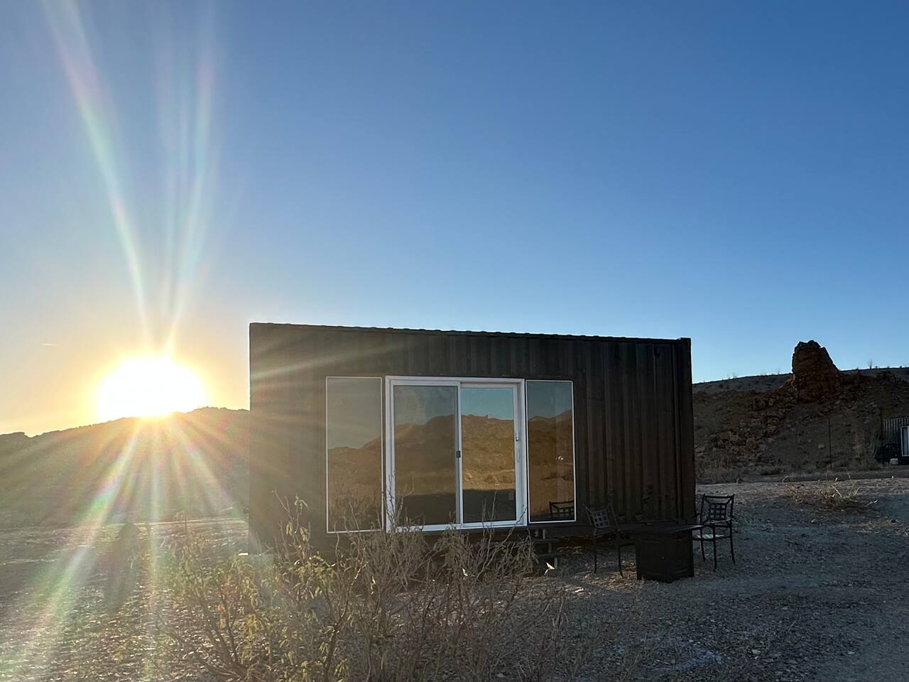 This off grid container home is the perfect retreat for stargazing enthusiasts, adventurous couples, and nature lovers seeking a peaceful and comfortable escape. The modern and stylish interiors provide comfort and convenience while guests enjoy breathtaking views of the surrounding mountains and a truly unique stargazing experience. Located just 15 minutes from Big Bend National Park. Access does require traveling an unpaved dirt road.